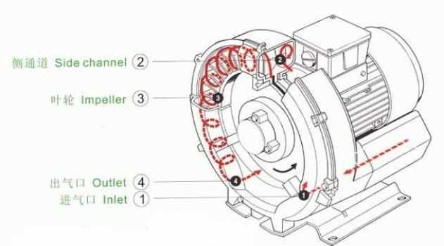 漩渦式氣泵是通過內部葉輪的轉動,葉輪四周的葉片與葉片之間會形成一系列漩渦形狀的氣體,經過不斷循環的增壓,最終經由出風口排出泵體外,具體工作方式及動畫參考:漩渦氣泵原理動圖